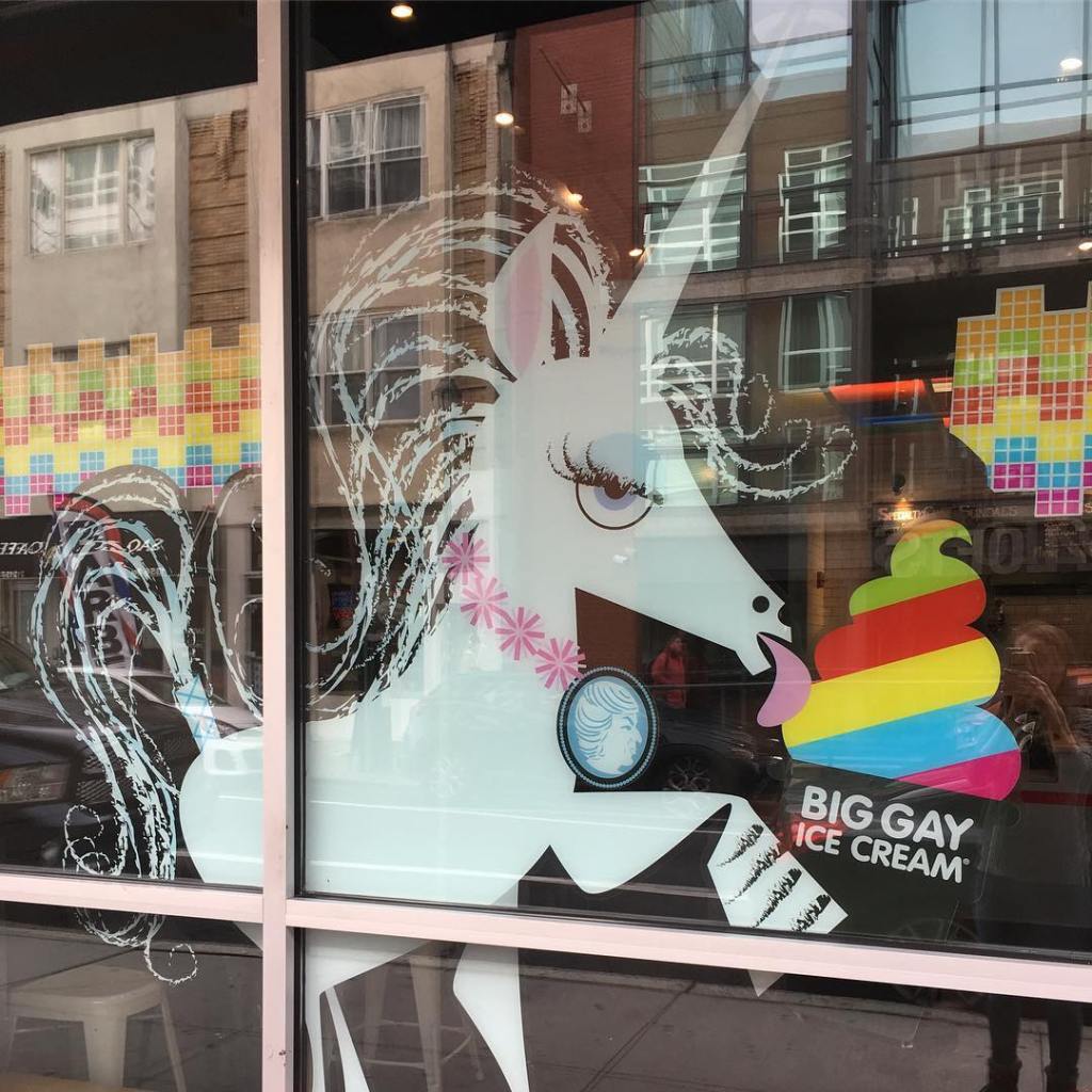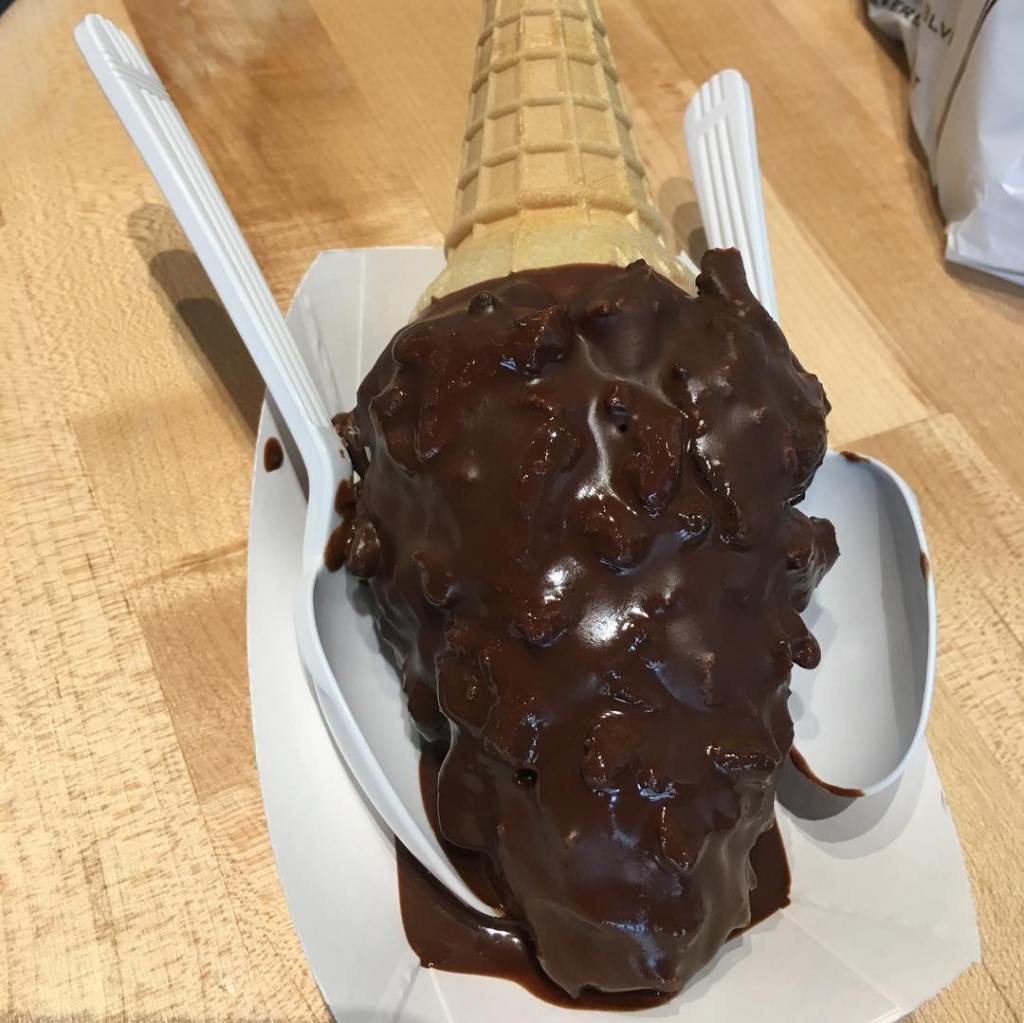 - Big Gay Ice Cream serves delicious ice cream cones covered in yummy toppings. Even though it was like 30 degrees I had to try some! I got the American Globs Cone. This is vanilla ice cream dipped in crushed up pretzels and slopped in chocolate. So worth the brain (and body) freeze!