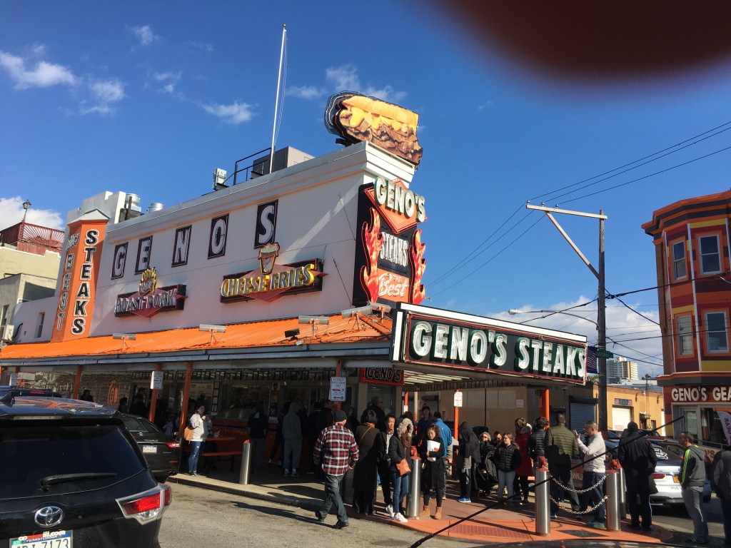 - Geno’s Steaks and Pat’s King of Steaks are both in the Italian Market, right across from each other. We did not go because they have awful Yelp reviews and enormous lines, our guide on the Italian Market Tour sad they were not worth waiting in line for. If anything, it is worth a visit in the evening to see the two store fronts lit up and to people watch.